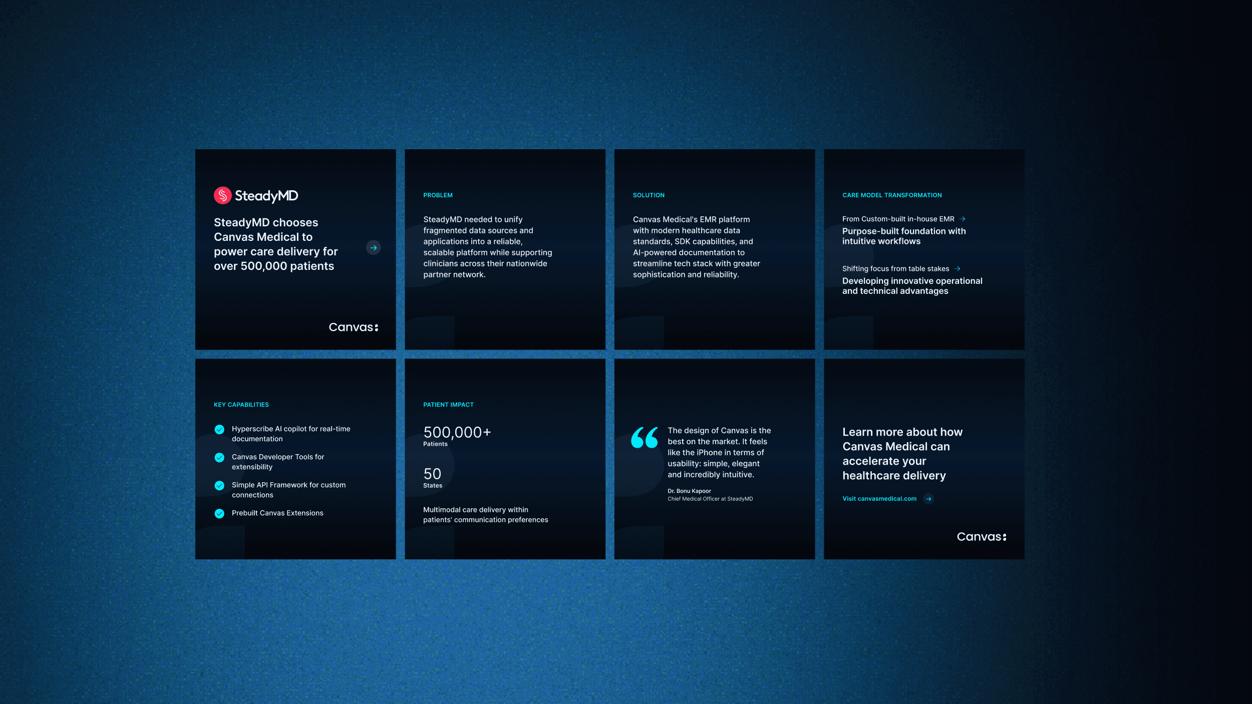 Canvas required a strategic brand refresh to showcase their transformation into an AI and developer-focused healthcare company. I spearheaded the development of a new visual identity including a modernized logo, detailed style guide, and custom illustration system. This brand system was then implemented across sales presentations, pitch decks, marketing materials, and digital touch points to support their repositioning in the market.