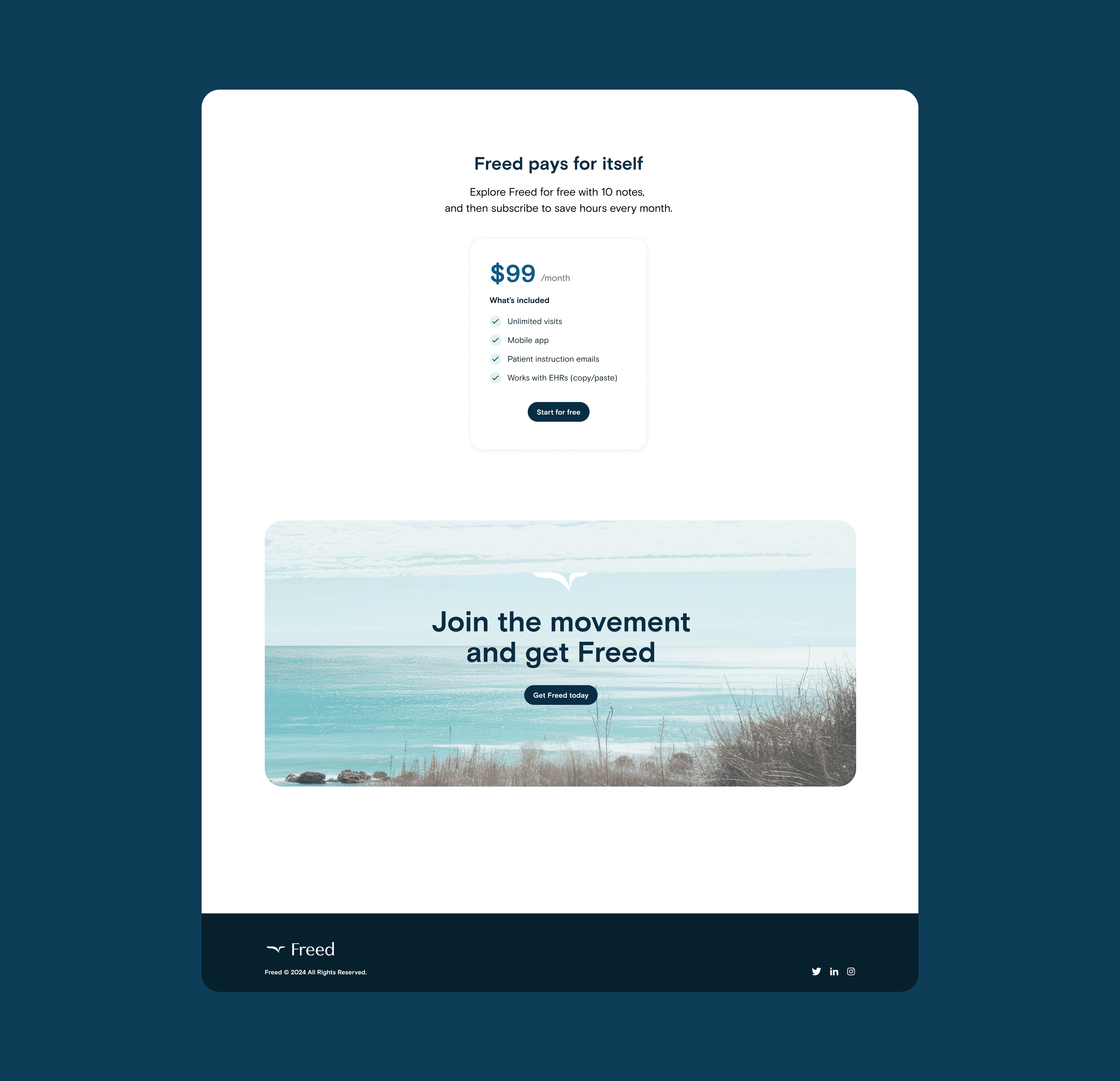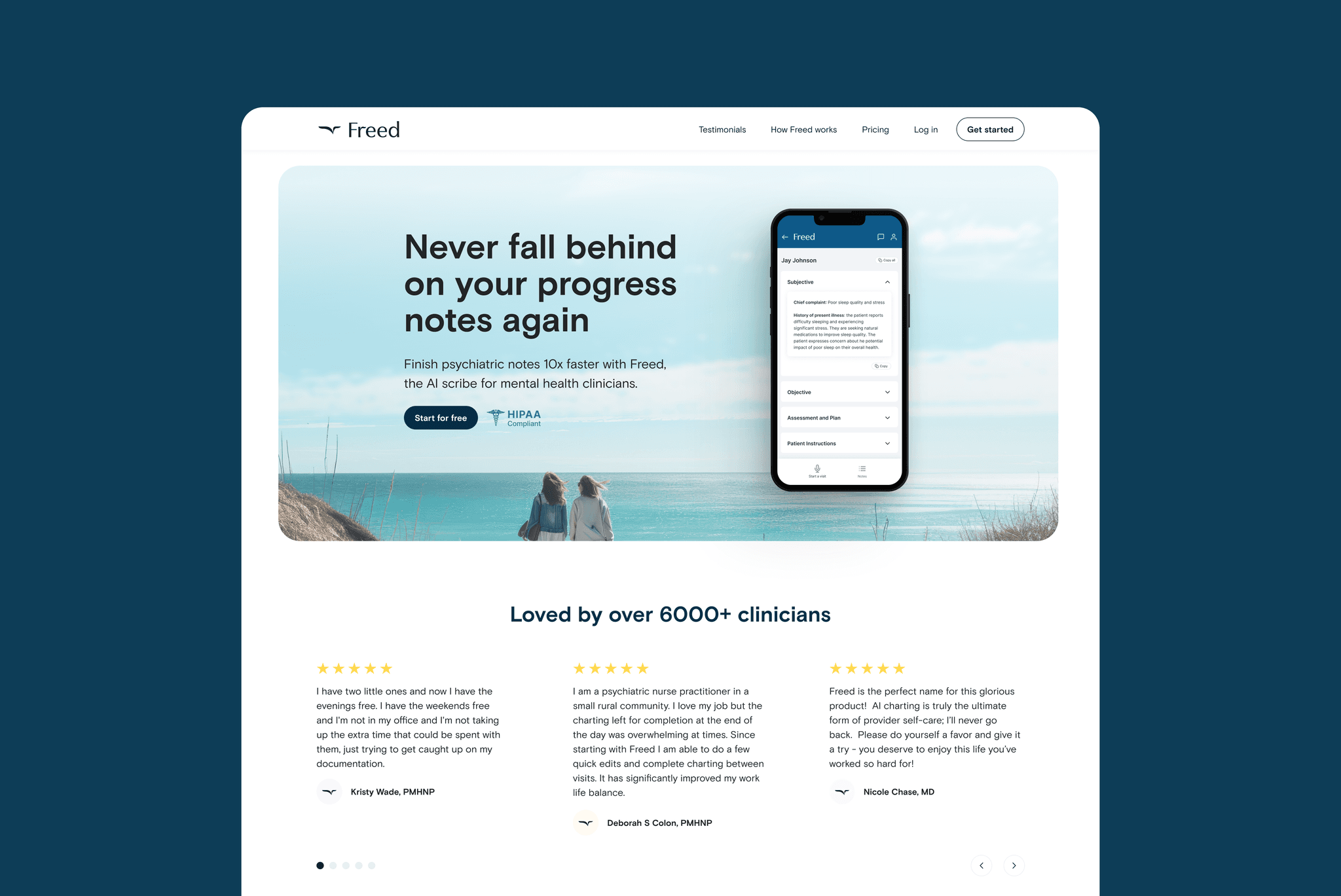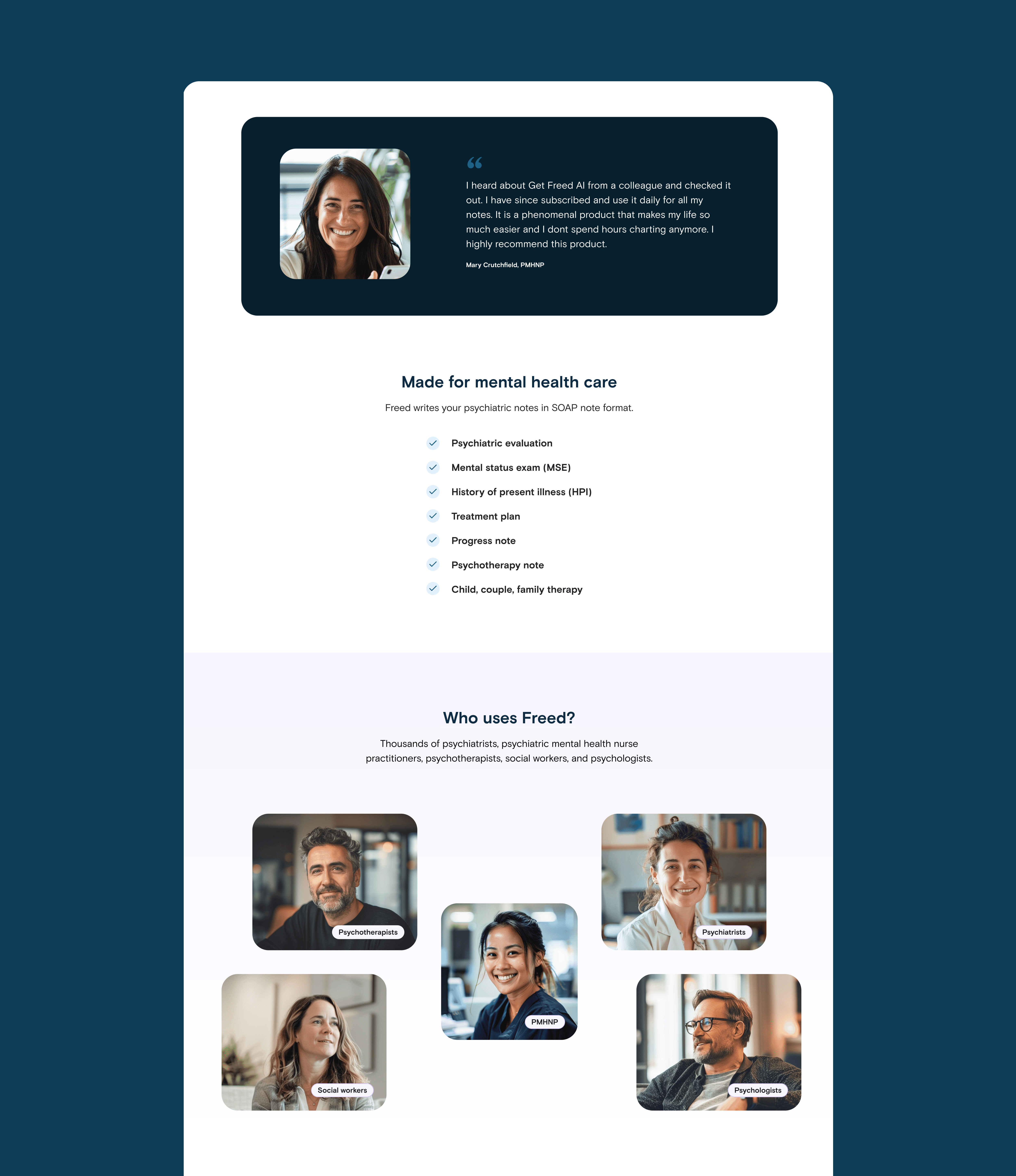 Freed is an AI scribe that listens, transcribes and writes notes for medical professionals. I was brought on to design a psychiatry specific landing page. The resulting design successfully enhanced Freed's marketing funnel, specifically catering to the growing mental health sector.